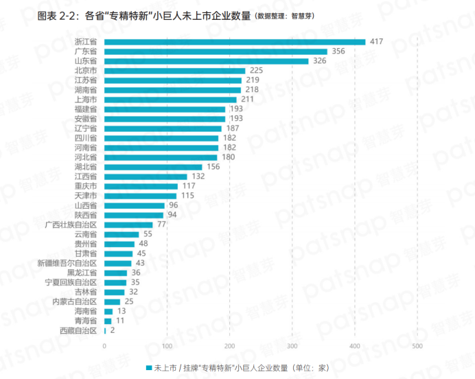 《報告》顯示,更進一步研究“專精特新”小巨人企業(yè)上市/掛牌情況可以發(fā)現(xiàn),“專精特新”小巨人企業(yè)上市/掛牌占比不到總數(shù)15%,也就是有超過85%的企業(yè)都將可能成為我國二級市場的潛在企業(yè),其中, 浙江省有417家,廣東省有356家,山東省有326家,北京市有225家,江蘇省有219家。