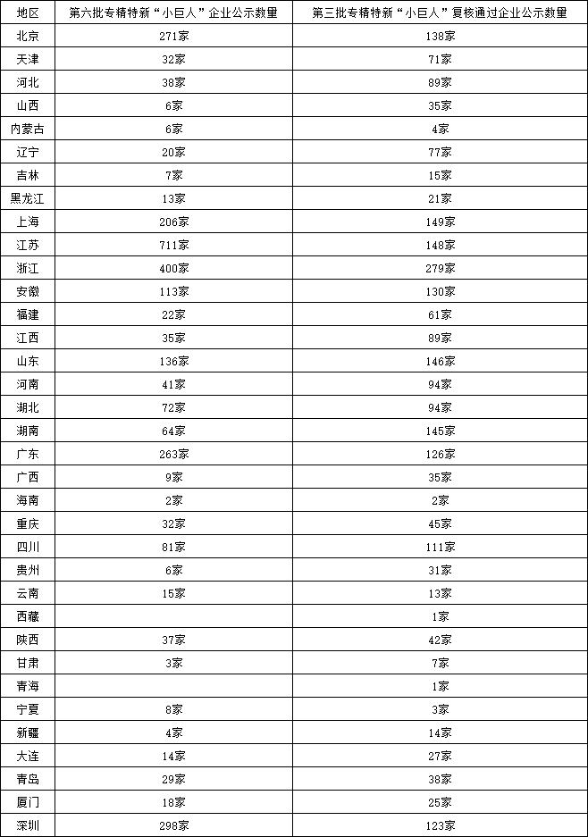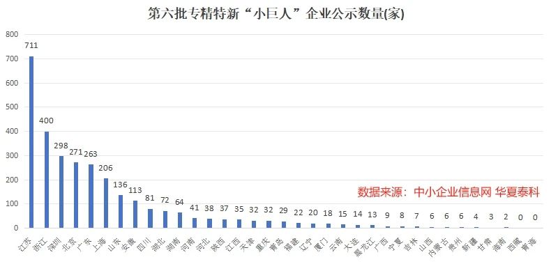 第六批專(zhuān)精特新企業(yè)的分布省市情況呈現(xiàn)出明顯的地域差異,經(jīng)濟(jì)大省的“小巨人”企業(yè)數(shù)量遙遙領(lǐng)先。在此次公示的第六批專(zhuān)精特新 “小巨人” 企業(yè)中,江蘇、廣東(含深圳)和浙江數(shù)量較多,分別有711家、561家和400家,三個(gè)省份“小巨人”企業(yè)數(shù)量占比超過(guò)一半。