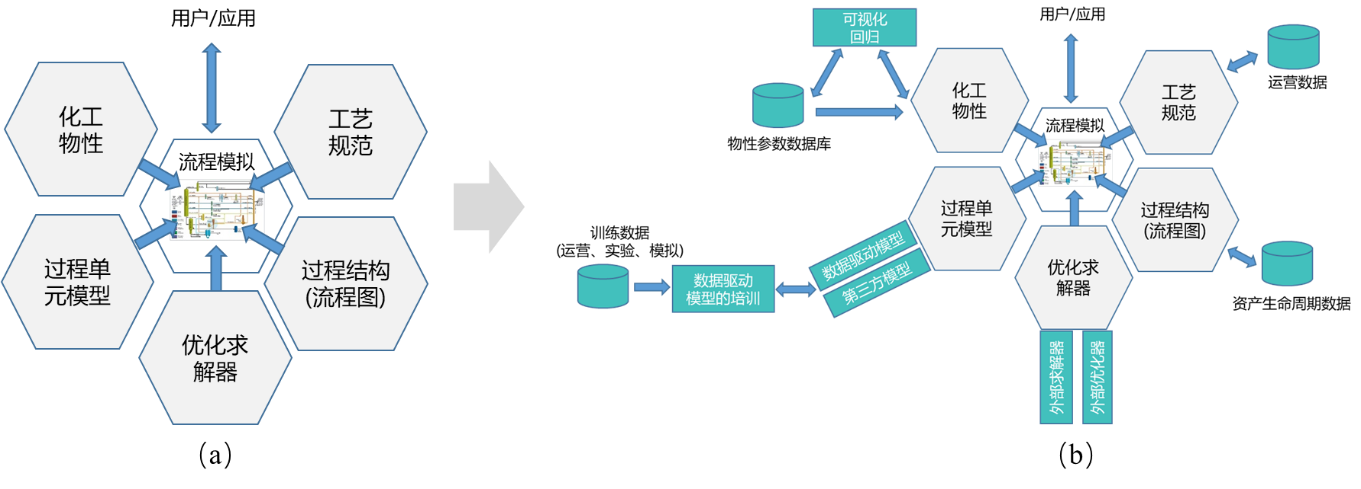 化工流程模擬軟件同樣向平臺化發(fā)展。化工流程模擬軟件應用于工藝設計、虛擬開車、操作員培訓、生產(chǎn)優(yōu)化等工廠全生命周期。經(jīng)過40多年發(fā)展,領先供應商的產(chǎn)品已經(jīng)集成穩(wěn) 態(tài)模擬與動態(tài)模擬、集成煉油模擬與化工模擬,主要包括5大功能模塊,即工藝規(guī)范、過程結構(流程圖) 、優(yōu)化求解器、過程單元模型和化工物性,如圖2a所示,并通過CAPE- OPEN軟件接口標準促進了通用流程模擬軟件平臺與單元模型、熱力學模型組件間的互操作。未來,化工流程模擬平臺軟件的5大模塊將進一步融合生產(chǎn)實時數(shù)據(jù)、實驗數(shù)據(jù)、資產(chǎn)生命周期數(shù)據(jù),進一步集成第三方求解器、優(yōu)化器、大數(shù)據(jù)模型、專用反應器模型、物性數(shù)據(jù)庫等,為打造石化工藝數(shù)字孿生提供平臺化支撐,如圖 2b)所示。