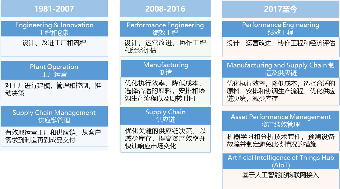 并購發(fā)展階段:從 1996 年起,艾斯本收購了超過 25 個領域中最優(yōu)秀的公司,打造了涵蓋績效工程、制造與供應鏈、資產(chǎn)績效管理三大類軟件的產(chǎn)品線,廣泛應用于能源、化工、制藥、工程設計以及其他采用化學工藝生產(chǎn)產(chǎn)品的行業(yè),如圖 3 所示。這與艾斯本從流程模擬、優(yōu)化到人工智能的業(yè)務發(fā)展邏輯保持同步。202110 月,艾默生以 60 億美元現(xiàn)金獲得艾斯本55% 的多數(shù)股權,并將旗下 OSI 公司的電力軟件和地質建模軟件業(yè)務并入艾斯本業(yè)務中。