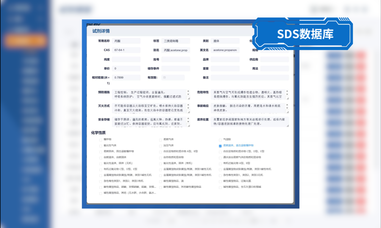 系統提供7000+種化學試劑基礎信息,包括但不限于理化性質、儲存注意事項和禁忌等,持續收錄更新,便于用戶查詢試劑信息。
