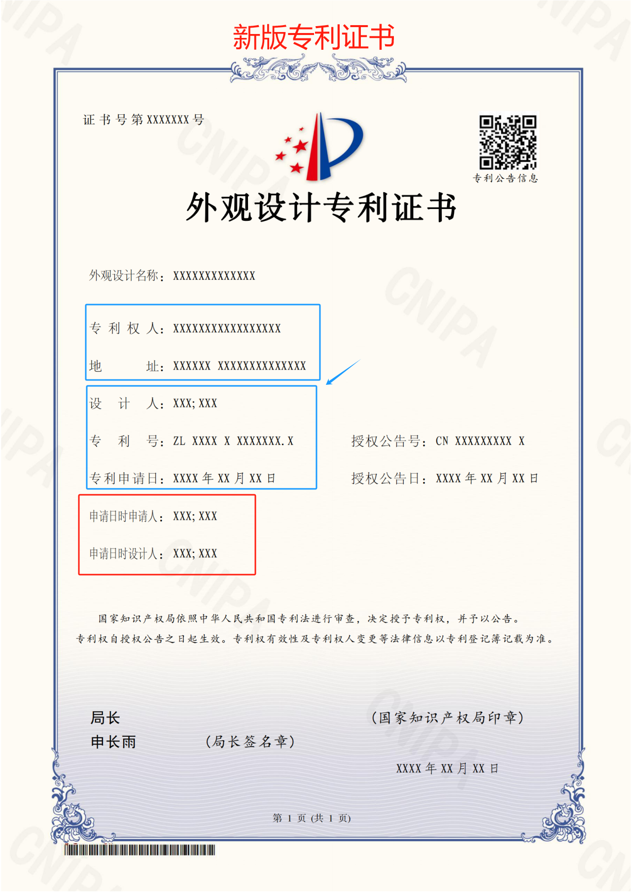 (新版外觀設(shè)計專利證書和現(xiàn)版外觀設(shè)計專利證書)