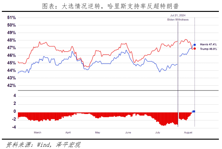 3)美國大選選情膠著,但候選人對華遏制態度不變。7月拜登退選,哈里斯迎來“政治蜜月期”,民調支持率反超特朗普,但選舉人票數仍落后于特朗普,選舉局勢不確定性較強。我們曾在《美國大選展望:特朗普會否重返白宮及影響》中設想兩種情景:一種是特朗普當選,美國將通脹再起、利率維持高位,逆全球化,可能引起美國再通脹、提高關稅,惡化盟友關系。另一種情形是哈里斯當選,主張團結盟友、支持創新、上調最低工資、保護薪水福利、醫改、接受難民等,預計將聯合盟友向中國施壓。但對華政策方面,無論誰當選預計都將保持遏制態度。
