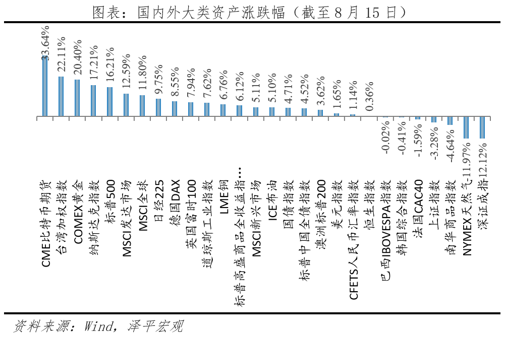 2024年初以來大類資產走勢分化,海外資產表現整體優于國內市場。海外市場權益市場領漲。2024年初至8月15日,WIND全球股票上漲12.70%,其中發達市場13.50%,新興市場5.95%,美歐漲幅靠前。標普商品指數5.95%,其中貴金屬、能源、軟商品兩位數漲幅領漲。國內市場,債市走牛、權益復蘇乏力。截至8月15日,上證指數-3.28%,WIND境內債券上漲4.54%,人民幣匯率指數1.1394%,小幅走強,南華商品指數-3.59%。上半年表現較好的資產有三類,一是以去美元化、避險屬性為主的比特幣和黃金;二是供給因素推動的原油,全球制造業復蘇邏輯的有色金屬類大宗品;三是價值風格的日本股市、AI浪潮的美國科技股等。