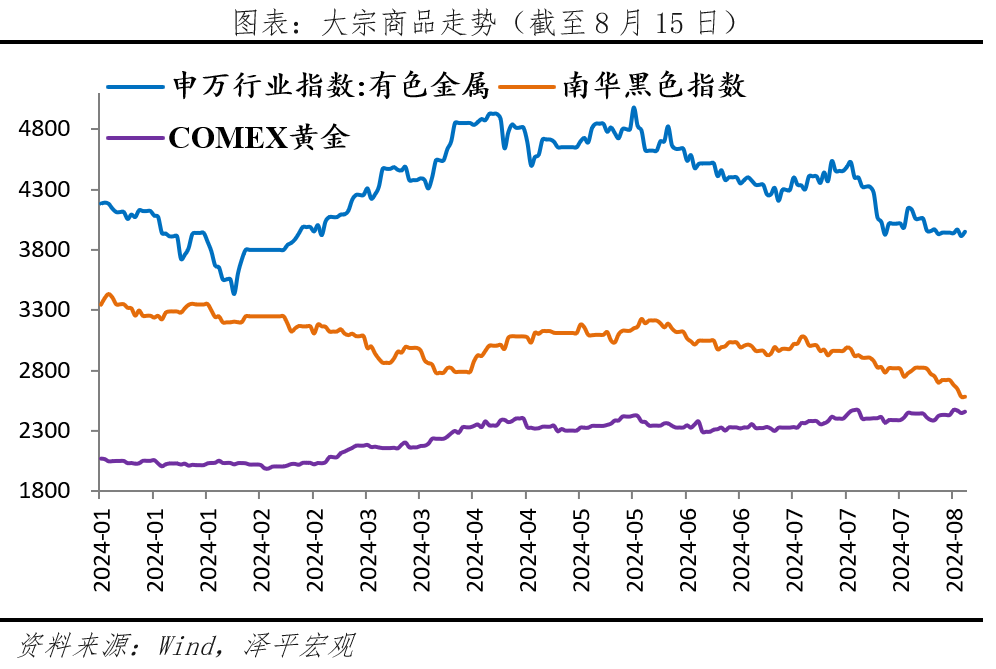 商品:國際定價的貴金屬、有色金屬上行,國內定價的黑色商品下行。黃金價格在3月降息預期并疊加市場去美元化情緒升溫后大漲,屢創新高,并維持高位。以銅為代表的有色金屬主要由海外定價,受益于供需驅動和寬松預期,跟隨金價上漲,5月創歷史新高,但伴隨海外制造業景氣度下行,銅價回調。黑色商品主要由國內定價,受國內基本面影響整體偏下滑。