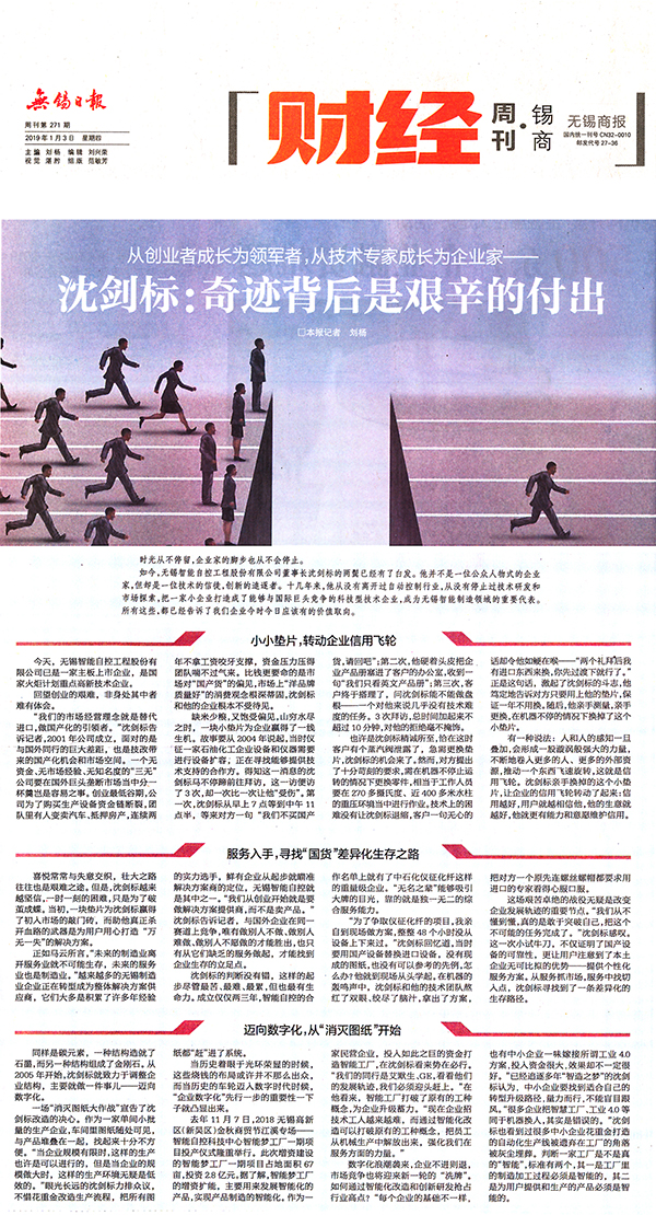 2019年1月3日,《無錫日報》財經周刊版頭版報道了對沈總的采訪,整篇報道清晰描繪出了無錫智能自控的發展歷程、沈總作為創業領頭人艱辛的心路歷程、創業團隊的無私奉獻和堅定信念,沈總如何從一個創業者成為領軍者、從技術專家成為企業家的角色轉變,沈總如何把十幾個人的企業勤勤懇懇扎扎實實地做成國內A股主板上市企業,也勾劃出無錫智能自控的未來發展路徑和方向。