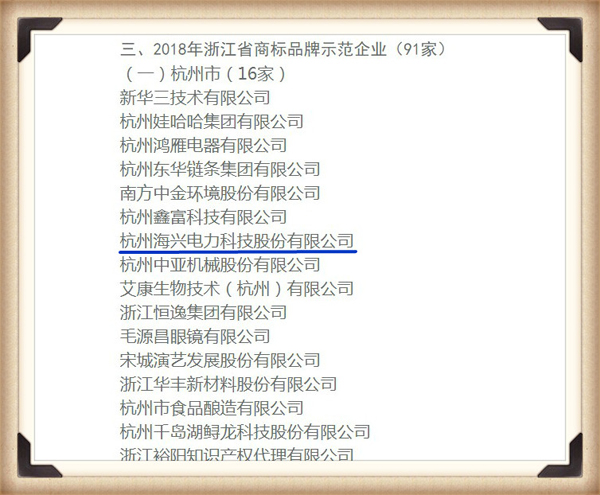 近日從浙江省市場(chǎng)監(jiān)督管理局(原省工商局)傳來(lái)喜訊,海興電力榮獲了2018年“浙江省商標(biāo)品牌示范企業(yè)”榮譽(yù)稱號(hào),獲此殊榮的杭州企業(yè)僅有16家。