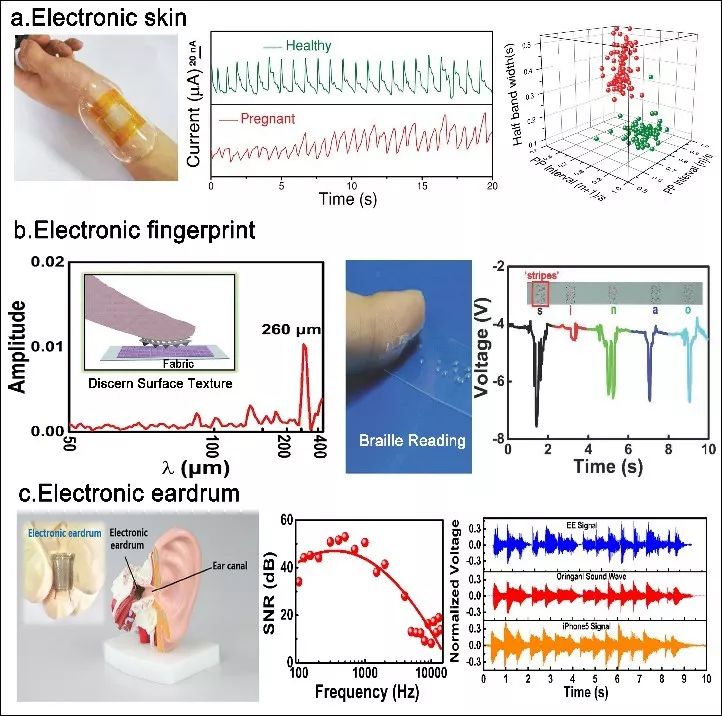 (a)柔性仿生電子皮膚傳感器(“E-skin”);(b)柔性仿生指紋傳感器(“Electronic fingerprint”);