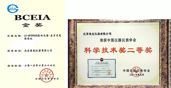 2015年10月,海光公司LC-AFS9560液相色譜-原子熒光聯(lián)用儀獲得第十六屆BCEIA 金獎(jiǎng)。為表彰該系列產(chǎn)品技術(shù)創(chuàng)新性及在市場銷售方面的出色表現(xiàn),以此類儀器為課題產(chǎn)品的《痕量砷、汞及其有毒化合物形態(tài)檢測儀的完善和產(chǎn)業(yè)化培育》項(xiàng)目榮獲了2017年中國儀器儀表學(xué)會(huì)頒發(fā)的科學(xué)技術(shù)獎(jiǎng)二等獎(jiǎng)。