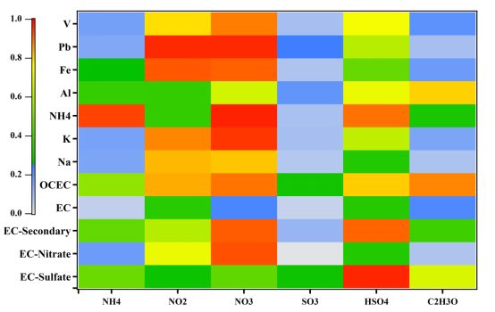 NH4+與OCEC粒子、EC-Sulfate和EC-Secondary的混合比較高,與EC-nitrate的混合程度較低,大氣中的氨更容易與有機(jī)物和硫酸鹽相結(jié)合。