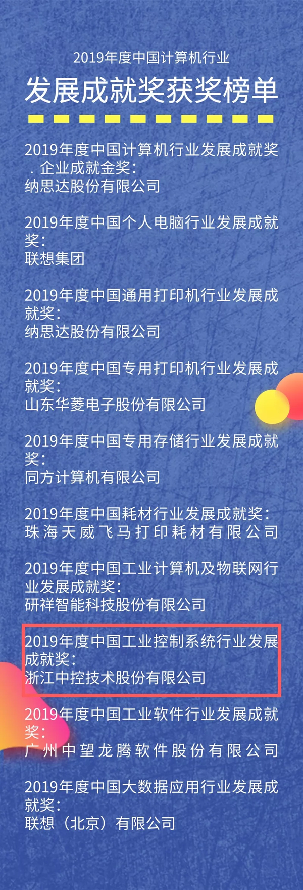 2019年9月11日,在2019世界計算機大會期間,由中國計算機行業協會組織舉辦的“2019第五屆中國計算機行業發展成就獎頒獎儀式”在湖南長沙圓滿結束。浙江中控技術股份有限公司榮獲“2019年度中國工業控制系統行業發展成就獎”,這不僅是計算機行業對中控在工控領域實力的認可,更是對中控長期以來為用戶創造價值的肯定。