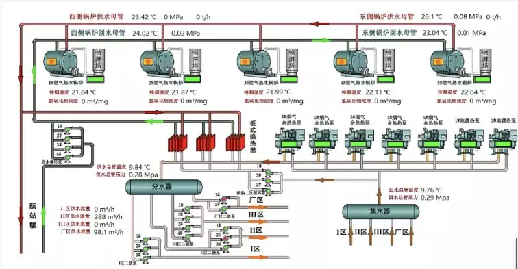 大興國(guó)際機(jī)場(chǎng)航站樓及主要配套設(shè)施區(qū)域約 142 萬(wàn)平米,1號(hào)能源站主廠房總規(guī)模為7臺(tái)58MW燃?xì)鉄崴仩t,其中2臺(tái)58MW燃?xì)鉄崴仩t為預(yù)留安裝位置,主要為航站樓及周邊區(qū)域冬季供熱。主廠房熱泵間內(nèi)設(shè)置2臺(tái)地源熱泵主機(jī)、5臺(tái)煙氣余熱熱泵、3套供熱板換,主要為I區(qū)、II區(qū)、III區(qū)及廠區(qū)冬季供熱、夏季制冷。中控的自控方案包括供熱、制冷控制“一鍵啟動(dòng)”策略,鍋爐相關(guān)聯(lián)鎖、安全保護(hù)控制等。