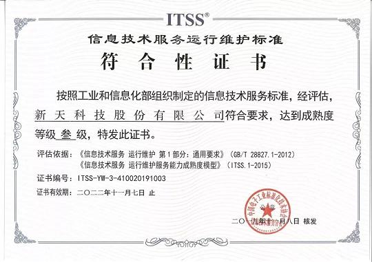 2019年10月22日至10月31日,中國電子工業(yè)標準化技術(shù)協(xié)會信息技術(shù)服務分會(ITSS分會)組織召開了《信息技術(shù)服務 運行維護服務能力成熟度模型》(以下稱運行維護服務能力成熟度)符合性評估專家評審會。根據(jù)專家評審會評審結(jié)果,ITSS分會于2019年11月1日至11月7日對擬授予符合性證書的單位名單進行了公示,根據(jù)公示結(jié)果及反饋意見對通過符合性評估的單位名單進行了最終確認。按照工業(yè)和信息化部組織制定的信息技術(shù)服務標準,經(jīng)評估,新天科技股份有限公司符合要求達到成熟度等級叁級,獲得“ITSS信息技術(shù)服務運行維護標準符合性證書”。