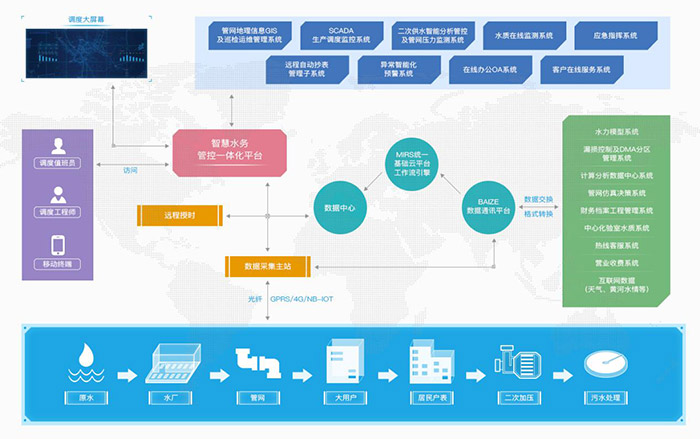 該平臺結(jié)合水務(wù)行業(yè)需求及水務(wù)信息化發(fā)展趨勢,以水務(wù)數(shù)據(jù)為核心、物聯(lián)網(wǎng)為基礎(chǔ),以WiFi、4G、NBIOT全覆蓋,寬帶通信為高速信息通道,建立覆蓋供、排水全過程的水聯(lián)網(wǎng),構(gòu)建智慧水務(wù)智能應(yīng)用,實(shí)現(xiàn)整合水務(wù)企業(yè)原有應(yīng)用系統(tǒng),構(gòu)建水務(wù)行業(yè)從源水到管網(wǎng)、從泵站到用戶終端的供排水全過程數(shù)據(jù)采集及監(jiān)測體系,實(shí)現(xiàn)管網(wǎng)全生命周期管理及供排水全過程的精細(xì)化管理以及智能調(diào)度,為給排水安全管理及運(yùn)營服務(wù)提供決策支持。