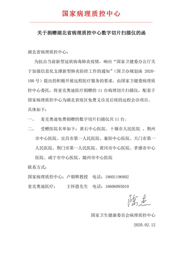 作為平臺技術支持單位的麥克奧迪收到信息之后,當即決定捐贈11臺的最新數字切片掃描設備支援湖北抗擊疫情,以配合國家病理質控中心為湖北省疫區(qū)開展義診及后續(xù)的遠程會診項目。