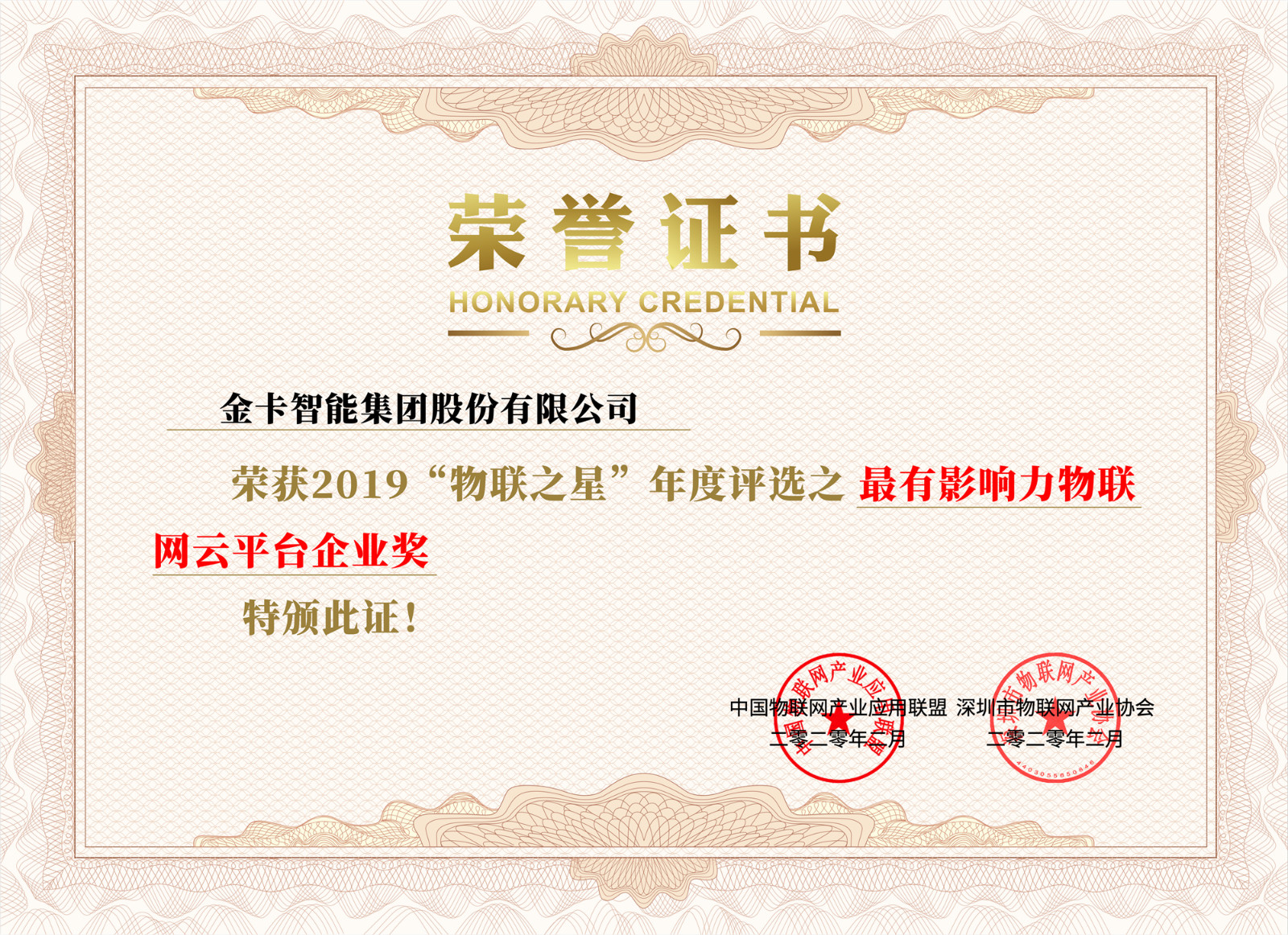 2月25日,由中國物聯網產業應用聯盟、深圳市物聯網產業協會主辦、物聯傳媒承辦的2019物聯之星中國物聯網行業年度評選落下帷幕,金卡智能斬獲“最具投資企業獎”、“最有影響力物聯云平臺企業獎”、“最佳智慧能源應用方案獎”,楊斌董事長榮獲“年度卓越人物獎”,成為獲獎最多的企業之一。