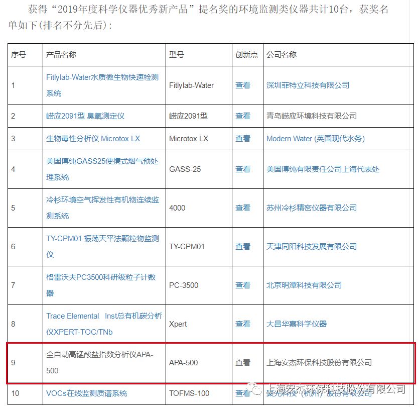 2020年3月11日,2019年度中國科學(xué)儀器行業(yè)“優(yōu)秀新品”評選活動“提名獎”揭曉,安杰科技 APA-500 全自動高錳酸鹽指數(shù)分析儀 獲得“2019年度科學(xué)儀器優(yōu)秀新產(chǎn)品”提名獎。