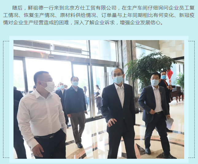為充分發揮統計部門優勢,及時客觀了解新冠疫情對小微企業的影響,進一步把脈疫情對工業經濟的影響程度,準確把握小微工業企業的需求和期待,4月15日,國家統計局黨組成員、副局長鮮祖德一行深入大興區小微工業企業一線,開展現場調研。北京市政府副秘書長王文杰、北京市統計局局長蔣力歌、國家統計局北京調查總隊總隊長徐榮華、國家統計局工業司副司長張衛華、北京市統計局副局長吳萬標、大興區常務副區長高念東陪同調研。