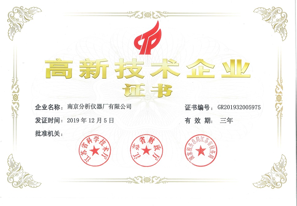 經過江蘇省科學技術廳、江蘇省財政廳和國家稅務總局江蘇省稅務局的綜合評定,南京分析儀器廠有限公司再次獲得國家高新技術企業稱號。