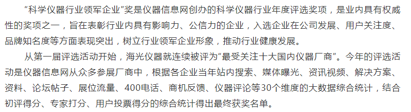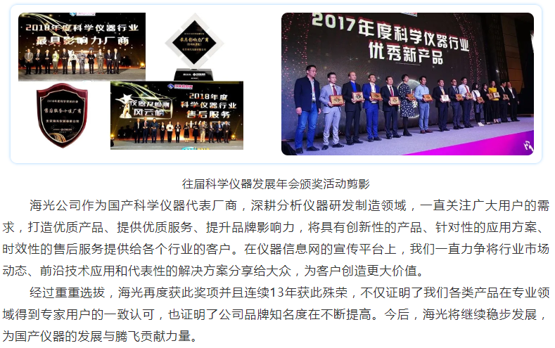 北京海光儀器有限公司是中國(guó)儀器儀表行業(yè)協(xié)會(huì)常務(wù)理事單位,主要從事分析儀器的研發(fā)、制造、銷售和售后服務(wù), 是中國(guó)知名的光譜分析儀器制造廠商,連續(xù)十二年被媒體評(píng)為“最具影響力國(guó)內(nèi)儀器廠商”稱號(hào),公司通過(guò)了質(zhì)量管理體系、環(huán)境管理體系、職業(yè)健康安全體系三大體系認(rèn)證,公司以原子熒光光度計(jì)、原子吸收分光光度計(jì)、測(cè)汞儀、流動(dòng)分析儀、快速溶劑萃取儀和等離子體發(fā)射光譜儀等分析儀器為主要產(chǎn)品,廣泛應(yīng)用于食品藥品、環(huán)境監(jiān)測(cè)、農(nóng)業(yè)、質(zhì)監(jiān)、自來(lái)水、檢驗(yàn)檢疫、地質(zhì)、第三方檢測(cè)、科研等領(lǐng)域,產(chǎn)品獲得國(guó)家科技進(jìn)步三等獎(jiǎng)、七次BCEIA 金獎(jiǎng)、自主創(chuàng)新金獎(jiǎng)、國(guó)產(chǎn)好儀器等多種獎(jiǎng)項(xiàng)。日前,2019年度“科學(xué)儀器行業(yè)領(lǐng)軍企業(yè)”(原“最具影響力廠商”)評(píng)選活動(dòng)獲獎(jiǎng)名單揭曉,北京海光儀器有限公司獲分析儀器類領(lǐng)軍企業(yè)稱號(hào),也是連續(xù)十三年獲此殊榮。