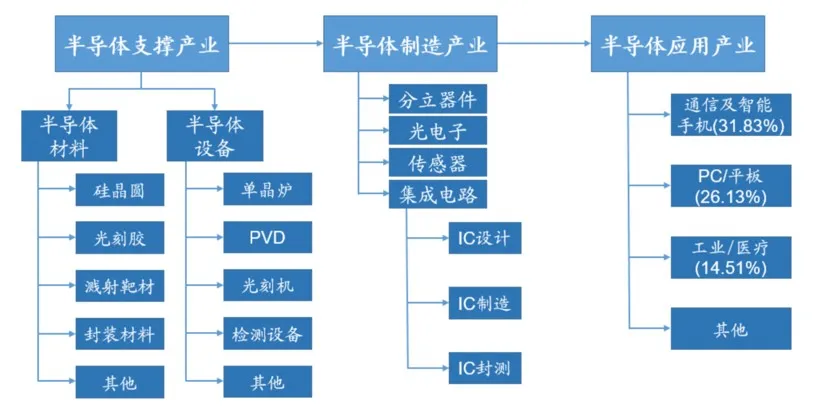 半導體產業鏈包括上游的半導體支撐產業,中游的半導體制造產業以及下游的半導體應用產業。半導體支撐產業包括半導體材料及設備,其中真空產品主要在半導體設備領域應用;中游半導體制造的核心是集成電路制造,包括IC設計、IC制造以及IC封測;下游的半導體應用領域眾多,全球半導體應用領域排名前三的行業是通信及智能手機、PC/平板、工業/醫療。