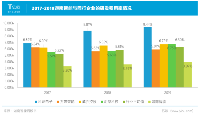 與上市公司相比,迦南智能的研發實力尚有不足之處。2016年-2019年,迦南智能研發費用率為3.30%、3.59%、3.97%,而同行可比公司均值分別為5.22%、5.81%、6.32%。如果迦南智能研發投入不足,很有可能導致公司錯失“電力物聯網”的機遇。
