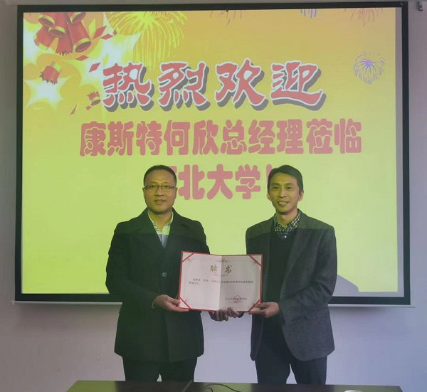 訪問期間,方立德院長代表學(xué)院向何欣總經(jīng)理頒發(fā)了兼職教授聘書。