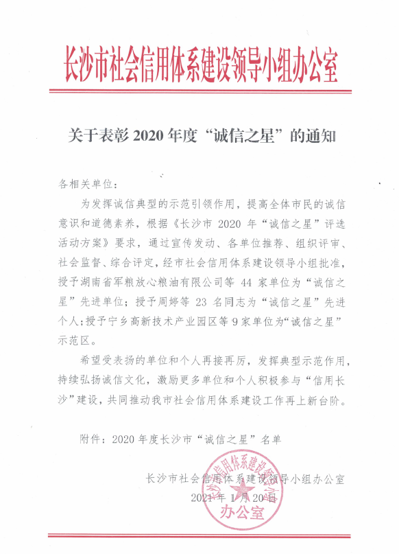 為推進(jìn)長(zhǎng)沙市社會(huì)信用體系建設(shè),提高全社會(huì)信用水平,樹(shù)立“信用長(zhǎng)沙”品牌,營(yíng)造優(yōu)良營(yíng)商環(huán)境,根據(jù)《長(zhǎng)沙市2020年“誠(chéng)信之星”評(píng)選活動(dòng)方案》要求,經(jīng)過(guò)層層推薦、審核、評(píng)審,威勝信息技術(shù)股份有限公司榮獲長(zhǎng)沙市社會(huì)信用體系建設(shè)領(lǐng)導(dǎo)小組辦公室頒發(fā)的“誠(chéng)信之星”榮譽(yù)稱(chēng)號(hào)。