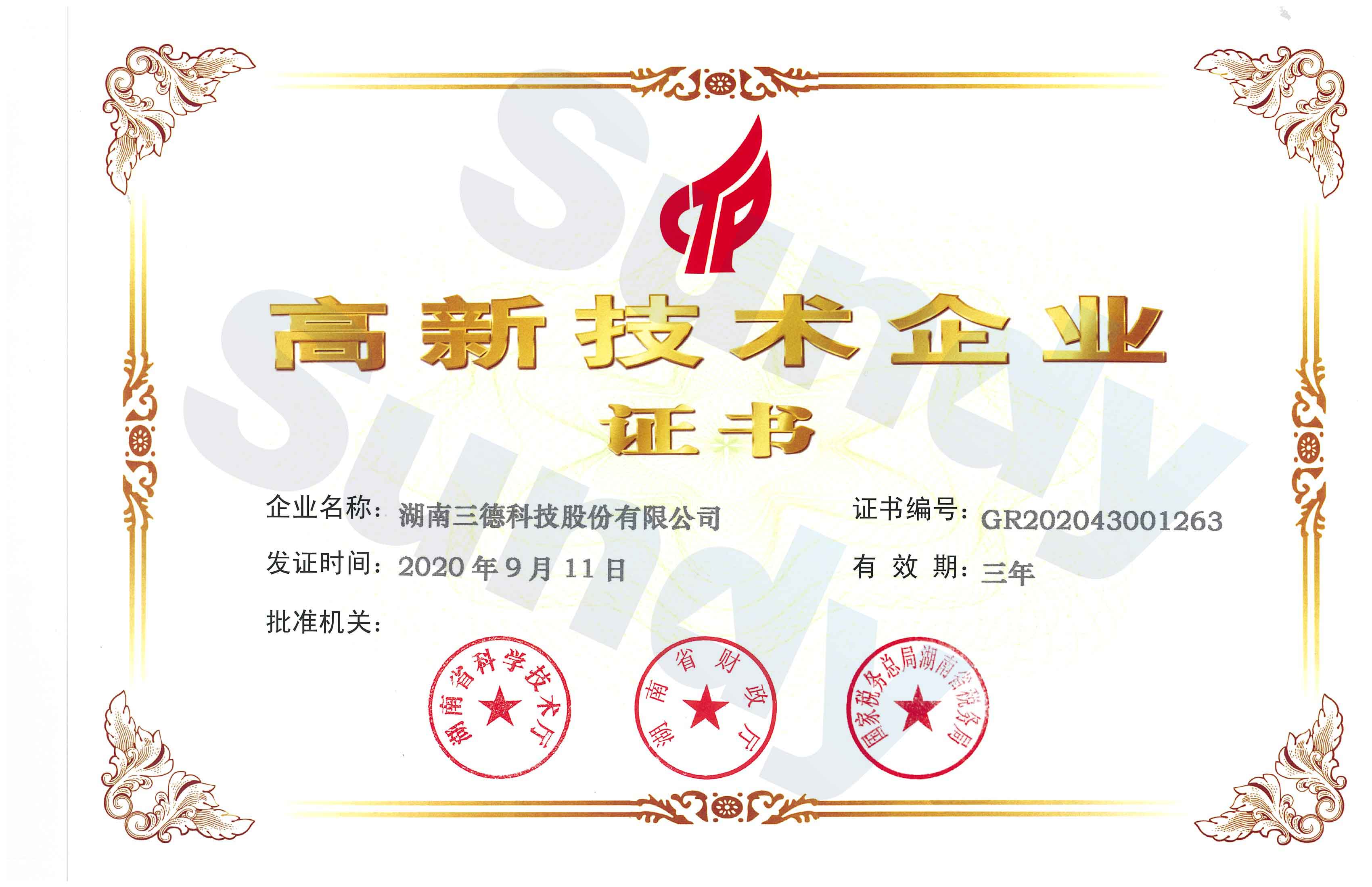 近日,湖南三德科技股份有限公司(下簡稱“三德科技”)及湖南三德盈泰環(huán)保科技有限公司(下簡稱“三德環(huán)保”)分別收到湖南省科學技術廳、湖南省財政廳、國家稅務總局湖南省稅務局聯(lián)合頒發(fā)的《高新技術企業(yè)證書》,二者同時獲評為“高新技術企業(yè)”。