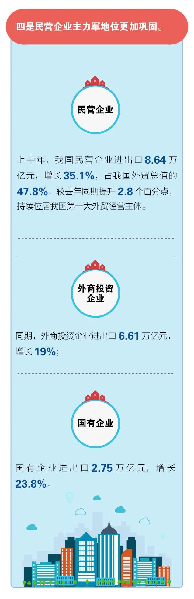 二是有進(jìn)出口實(shí)績的民營企業(yè)增多。上半年,有進(jìn)出口實(shí)績的民營企業(yè)39.7萬家,同比增加了3.7萬家,占有進(jìn)出口實(shí)績企業(yè)總數(shù)的82.8%。