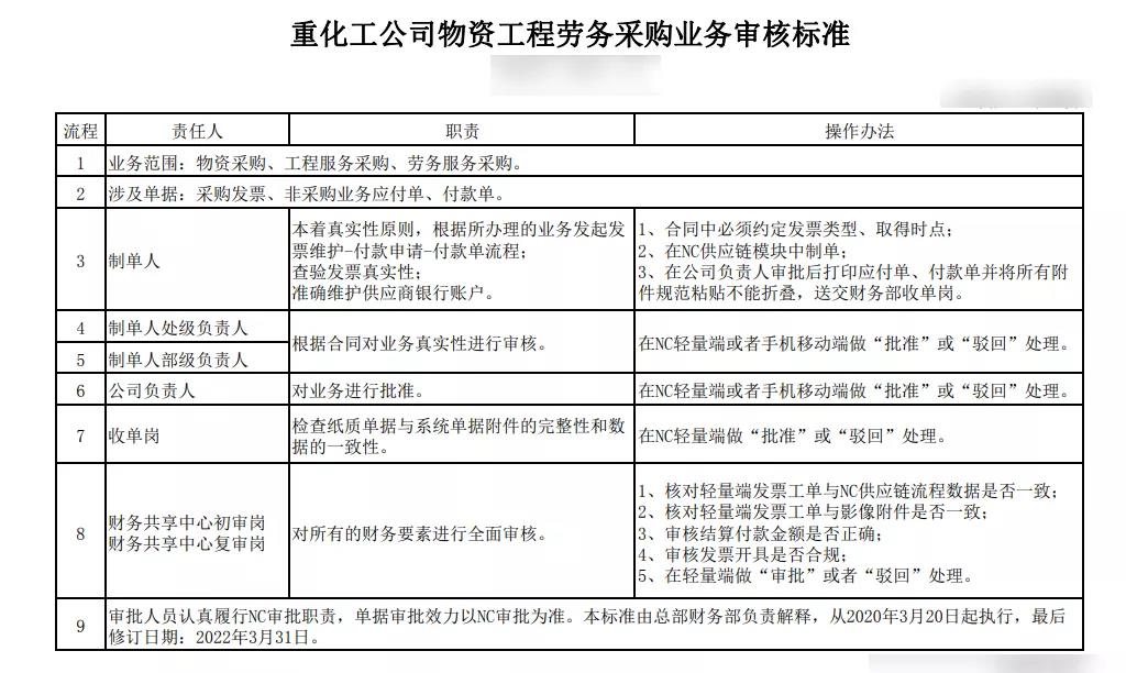 還是以東方希望集團(tuán)的業(yè)務(wù)為例。從下面的業(yè)務(wù)審核標(biāo)準(zhǔn)可以看出,審批流程是:制單人-制單人處級負(fù)責(zé)人-制單人部級負(fù)責(zé)人-公司負(fù)責(zé)人-收單崗-財(cái)務(wù)共享中心初審崗-財(cái)務(wù)共享中心復(fù)審,這是一個(gè)基本業(yè)務(wù)流程。有了基本的業(yè)務(wù)流程就有了對應(yīng)的職責(zé)和操作辦法,這就是業(yè)務(wù)流程影響管理標(biāo)準(zhǔn)。