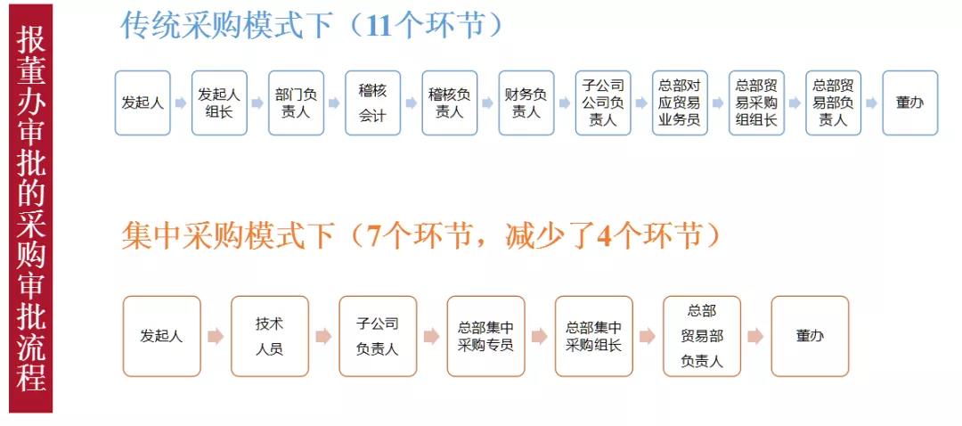 在傳統(tǒng)的采購模式下,一個(gè)報(bào)董辦審批的基本采購審批流程有11個(gè)環(huán)節(jié),而實(shí)現(xiàn)集中共享采購的審批只有7個(gè)環(huán)節(jié),減少了4個(gè)環(huán)節(jié),審批效率提升了36%,效率提升帶來責(zé)任更加清晰。