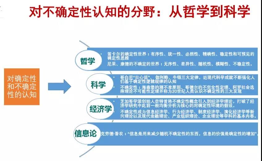 化解不確定性的“三部曲”。第一,理解和認知世界運行的規(guī)律,是化解不確定性的邏輯起點;第二,理解運行規(guī)律之后需要預測將會發(fā)生什么,這是決策的基礎和依據;第三是控制,是將決策付諸行動的具體路徑。