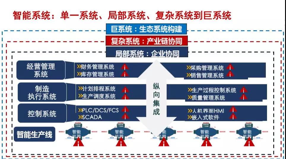 德國工業(yè)4.0講橫向集成、縱向集成、端到端集成,從這個角度來講,什么是集成?集成是數據的互聯互聯網互操作,集成的本質就是對制造資源優(yōu)化范圍、領域深度的描述,從自動化到智能化,就是從局部優(yōu)化到全局優(yōu)化的過程,在時間上優(yōu)化只有起點沒有終點,空間上參與優(yōu)化的資源從點、線、面、大系統、巨系統的方向不斷地擴展。如果說,自動化是單點的、低水平的,有限的資源優(yōu)化;那么,智能化是多點、高水平、全局的資源優(yōu)化。所謂集成的過程,就是對制造過程的范圍領域不斷地深化的過程。
