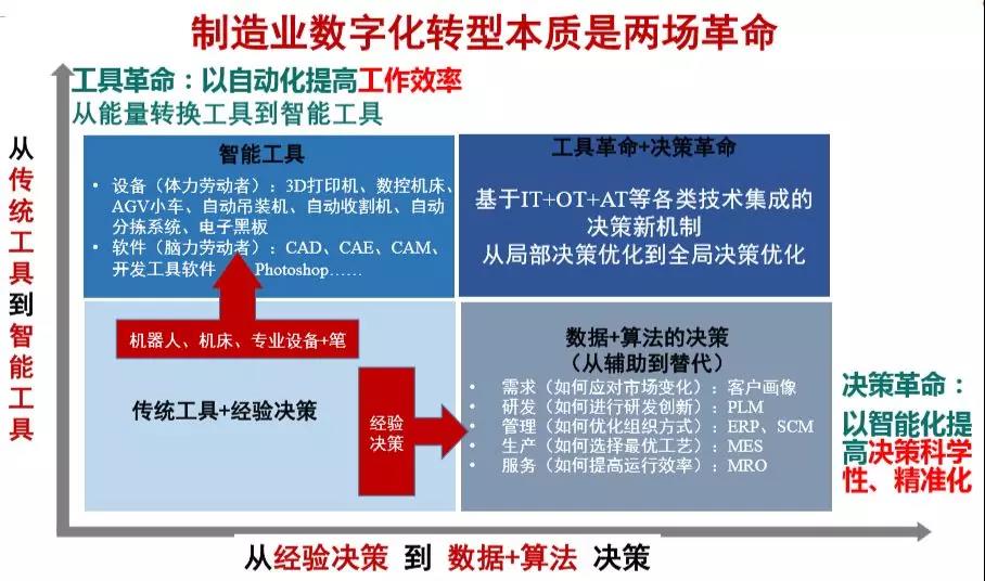 我們可以從這兩個維度上觀察和理解企業(yè)的數字化轉型。從工具革命的維度看,自動化的工具提高了體力勞動者和腦力勞動者的效率,傳統的機器人、機床、專業(yè)設備等傳統工具正升級為3D打印、數控機床、自動吊裝設備、自動分檢系統等智能工具,傳統能量轉換工具正在向智能工具演變,大幅提高了體力勞動者效率;同時CAD、CAE、CAM等軟件工具提高了腦力勞動者的工具效率。從決策革命的維度看,企業(yè)內部 EPR、CRM、SCM、MES等通用軟件和自研軟件系統,通過不斷挖掘、匯聚、分析消費者以及研發(fā)、生產、供應鏈等數據,基于數據+算法構建一套新的決策機制,替代傳統的經驗決策,實現更加高效、科學、精準、及時的決策,以適應需求的快速變化。
