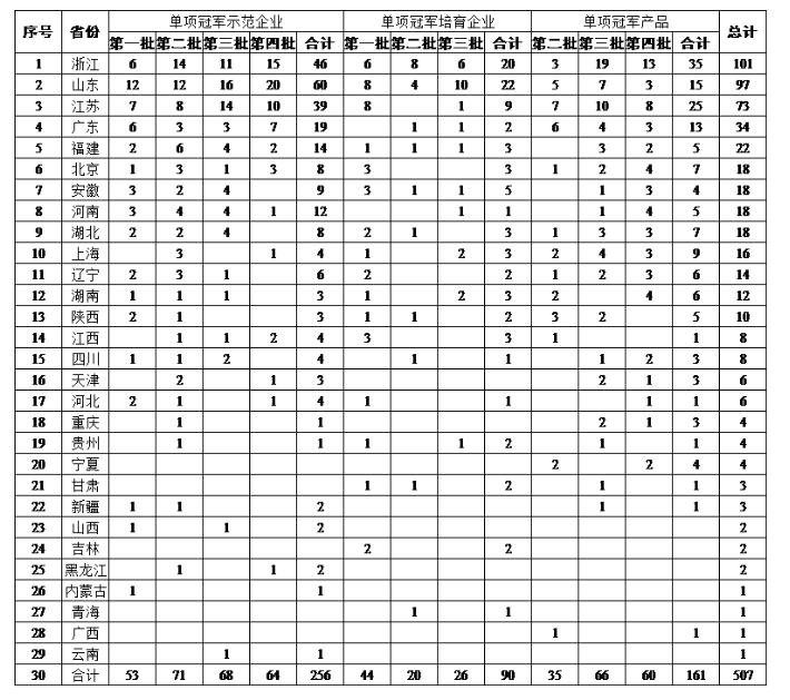2016年3月,工信部印發《制造業單項冠軍企業培育提升專項行動實施方案》,從聚焦有限目標市場、主營產品市場占有率、持續創新能力強、經營業績優、長期專注主營產品、符合制造業重點發展方向、重視品牌培育、環保能耗達標、管理制度規范等9個方面明確了單項冠軍企業的條件,引導制造企業專注創新和產品質量提升(表3)。方案指出,“到2025年,總結提升200家制造業單項冠軍示范企業,發現和培育600家有潛力成長為單項冠軍的企業”。目前,制造業單項冠軍培育提升專項行動實施四年以來,先后遴選了4批共256家單項冠軍示范企業、90家培育企業、161項單項冠軍產品,累計507家(圖2)。單項冠軍企業與制造業資源集聚度是高度相關的。東部沿海地區的浙江、山東、江蘇名列前茅(表4),擁有占全國53.5%的單項冠軍企業,展示出區域經濟和各地制造業的發展水平。
