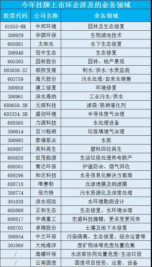 而如今上市的環(huán)保企業(yè),無(wú)論是主板,還是創(chuàng)業(yè)板、科創(chuàng)板,都有一個(gè)共性,就是大都是給早期工程項(xiàng)目做配套、做服務(wù)、做運(yùn)營(yíng)的企業(yè),這些企業(yè)伴隨著“前輩們”成長(zhǎng),他們自身也在壯大。所以我們看到近兩年上市的企業(yè),既是環(huán)保行業(yè)非常細(xì)分的子領(lǐng)域,也是產(chǎn)業(yè)下游設(shè)備技術(shù)廠商,做膜、水泵、生物濾池、勘測(cè)設(shè)計(jì)、水質(zhì)監(jiān)測(cè)、垃圾滲濾液、填埋氣治理的都紛紛登錄資本市場(chǎng)(如下圖)。