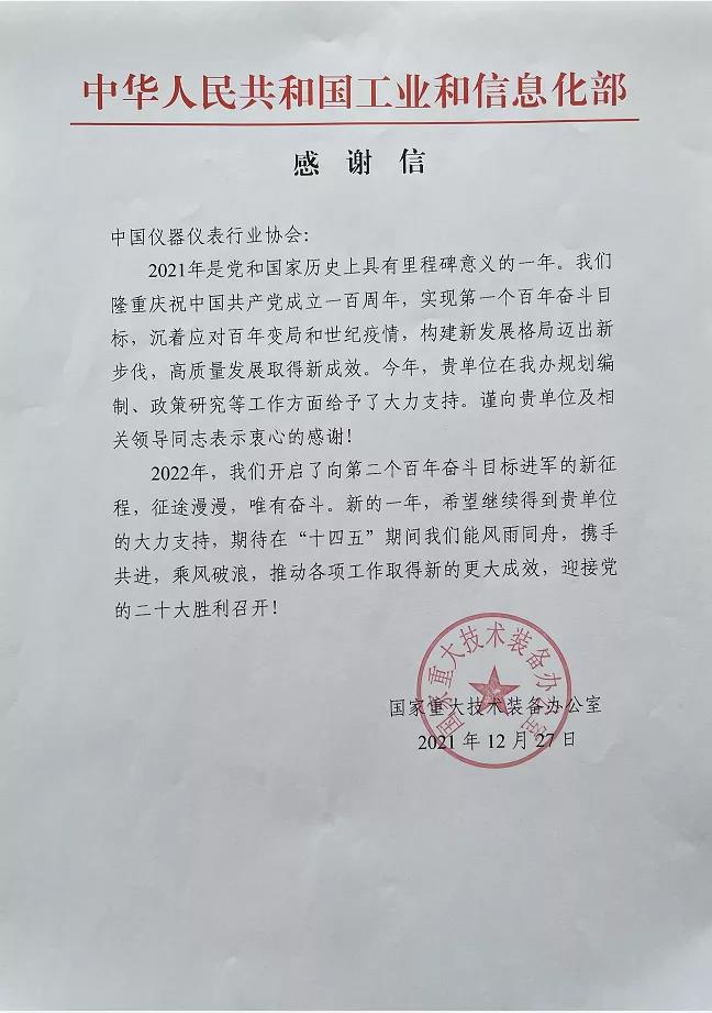 近日,工業(yè)和信息化部重大技術(shù)裝備辦公室、商務(wù)部對外貿(mào)易司向中國儀器儀表行業(yè)協(xié)會(huì)發(fā)來感謝信,對協(xié)會(huì)2021年在發(fā)揮行業(yè)組織橋梁紐帶作用、凝聚行業(yè)發(fā)展共識(shí)、反映行業(yè)運(yùn)行訴求、促進(jìn)行業(yè)健康發(fā)展、為相關(guān)部門提供信息支撐和決策參考等方面發(fā)揮的作用和開展的工作給予高度評(píng)價(jià),對協(xié)會(huì)積極配合部委工作給予的大力支持表示誠摯感謝。