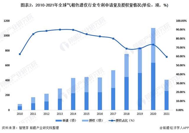在專利授權方面,2010-2020年全球氣相色譜儀行業專利授權數量同樣呈現逐漸增長的趨勢,2021年有所下降。2021年全球氣相色譜儀行業專利授權數量為153項,授權比重僅為59.77%。