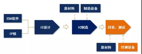 半導體產業(yè)鏈可大致分為設計、晶圓制造與封裝測試三大環(huán)節(jié),芯片設計環(huán)節(jié)產出各類芯片的設計版圖,晶圓制造環(huán)節(jié)根據設計版圖進行掩膜制作,形成模版,并在晶圓上進行加工,封裝測試環(huán)節(jié)對生產出來的合格晶圓裸晶進行切割、焊線、塑封,并對封裝完成的芯片進行性能測試。
