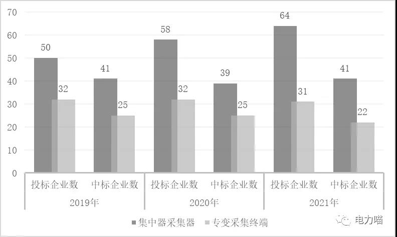 在國(guó)網(wǎng)集中器采集器市場(chǎng),近三年共有70家企業(yè)參與競(jìng)爭(zhēng),共有45家企業(yè)有中標(biāo)記錄。在國(guó)網(wǎng)專變采集終端市場(chǎng),近三年共有37家企業(yè)參與競(jìng)爭(zhēng),共有27家企業(yè)有中標(biāo)記錄。
