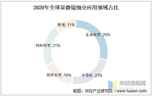 據統計,2020年全球顯微鏡細分應用領域情況為:生命科學占比29%、半導體材料占比23%、材料科學占比21%、納米科學占比16%、其他領域占比11%。