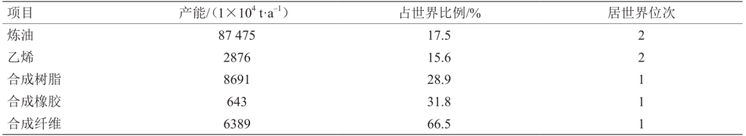 表 1 2019 年我國石化產(chǎn)業(yè)主要產(chǎn)品產(chǎn)能的世界位次