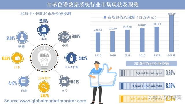 數據顯示,全球色譜數據系統行業在2015年的市場總值為255.43百萬美元,此后便逐年增長,到2019年增長到了333.19百萬美元,2015-2019年復合年增長率(CAGR)為6.87%。結合市場環境及發展規律,我們進行了一系列函數運算并用科學模型推導了未來5年的數據,最后可預測,到2025年,行業總值將達483.19百萬美元。