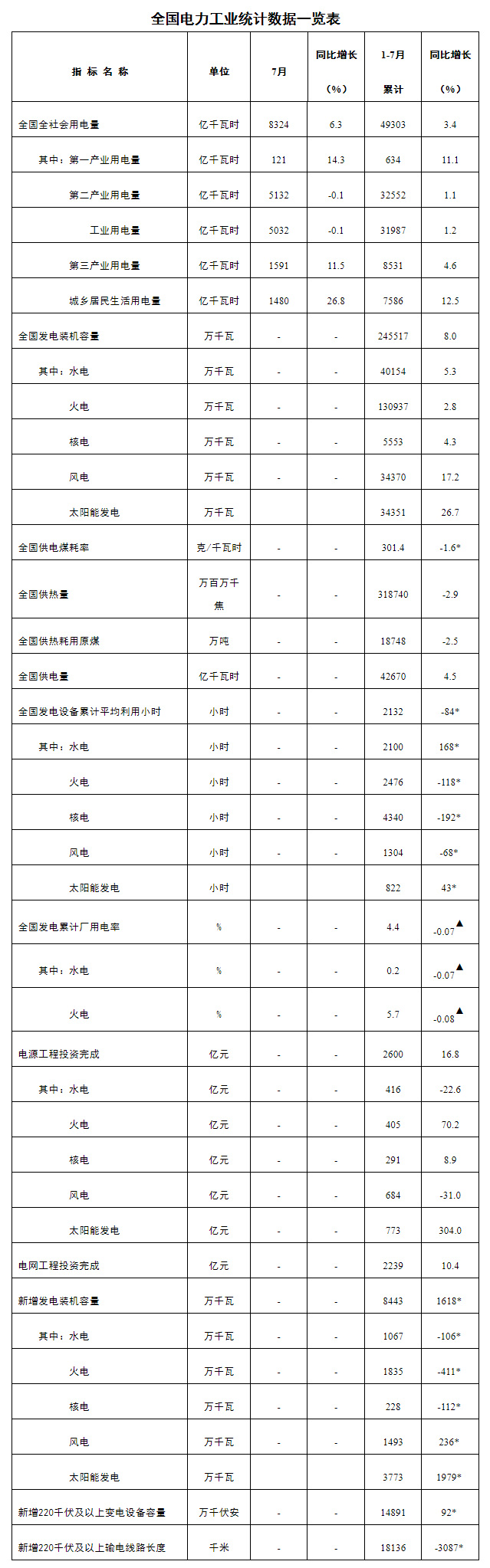 注:1.全社會(huì)用電量為全口徑數(shù)據(jù),全國供電量為調(diào)度口徑數(shù)據(jù)。2.“同比增長”列中,標(biāo)*的指標(biāo)為絕對量;標(biāo)▲的指標(biāo)為百分點(diǎn)。