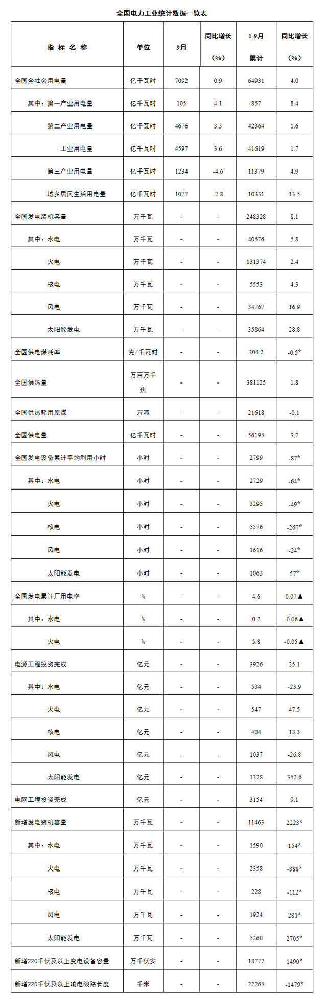 1—9月份,全國發(fā)電設備累計平均利用2799小時,比上年同期減少87小時。其中,火電3295小時,比上年同期減少49小時;核電5576小時,比上年同期減少267小時;風電1616小時,比上年同期減少24小時。