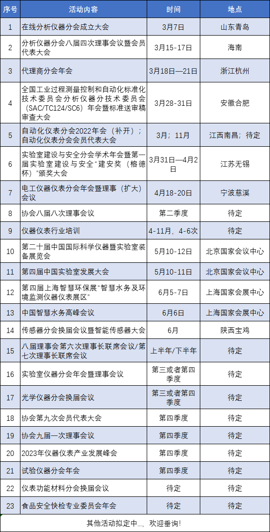 為發(fā)揮中國儀器儀表行業(yè)協(xié)會(huì)支撐政府、服務(wù)行業(yè)的橋梁作用,促進(jìn)行業(yè)間交流與合作,引導(dǎo)產(chǎn)業(yè)健康發(fā)展,推進(jìn)各項(xiàng)工作的開展,更好地為協(xié)會(huì)會(huì)員單位服務(wù),特制定中國儀器儀表行業(yè)協(xié)會(huì)2023年度主要活動(dòng)安排,供大家了解參與。