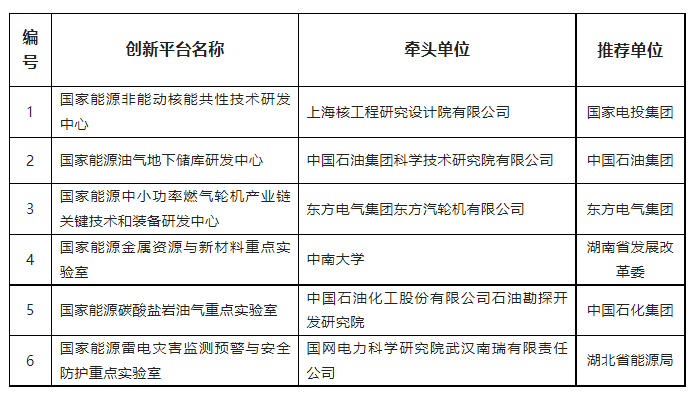 此次公示的名單包括:國家能源非能動核能共性技術研發(fā)中心、國家能源油氣地下儲庫研發(fā)中心、國家能源中小功率燃氣輪機產業(yè)鏈關鍵技術和裝備研發(fā)中心、國家能源金屬資源與新材料重點實驗室、國家能源碳酸鹽巖油氣重點實驗室、國家能源雷電災害監(jiān)測預警與安全防護重點實驗室,共六個。