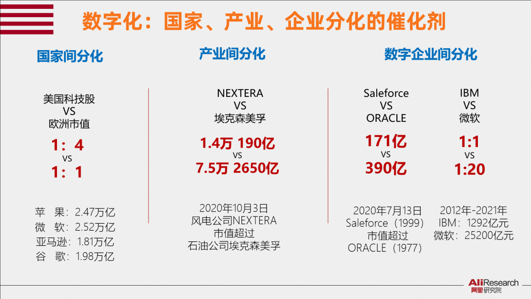 疫情前,美國所有科技公司的估值僅相當(dāng)于歐洲所有國家上市公司估值的1/4。疫情后,美國科技公司的估值已經(jīng)超過了歐洲所有國家上市公司總估值。今天,銷售額只有190億美元的新能源風(fēng)電公司NEXTER的市值,已經(jīng)超過了曾經(jīng)的全球市值最大公司艾克森美孚。ICT產(chǎn)業(yè)內(nèi)部也在急劇分化,IBM、微軟在十年前的市值都差不多 ,但今天微軟市值已經(jīng)相當(dāng)于IBM的10-20倍。