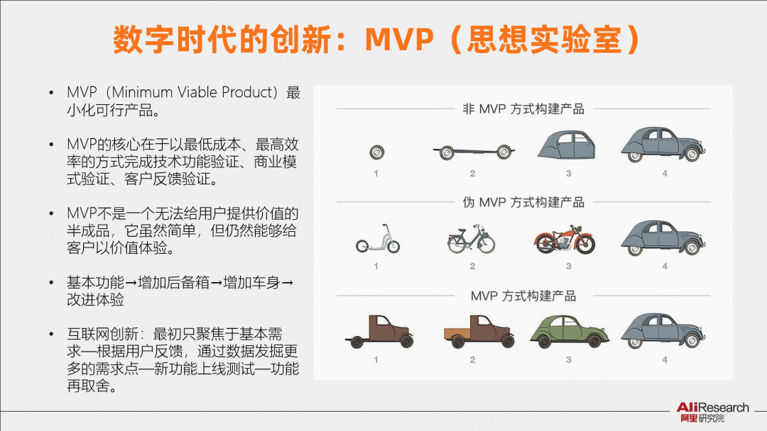 面對需求的巨變,企業(yè)構(gòu)建一個思想實驗室:MVP(Minimum Viable Product)最小化可行產(chǎn)品。MVP的核心在于以最低成本、最高效率的方式完成技術(shù)功能驗證、商業(yè)模式驗證、客戶反饋驗證。MVP不是一個無法給用戶提供價值的半成品,它雖然簡單,但仍然能夠給客戶以價值體驗。如開發(fā)一輛汽車,其路徑是,基本功能→增加后備箱→增加車身→改進(jìn)體驗。如同互聯(lián)網(wǎng)的創(chuàng)新:最初只聚焦于基本需求—根據(jù)用戶反饋,通過數(shù)據(jù)發(fā)掘更多的需求點(diǎn)—新功能上線測試—功能再取舍。